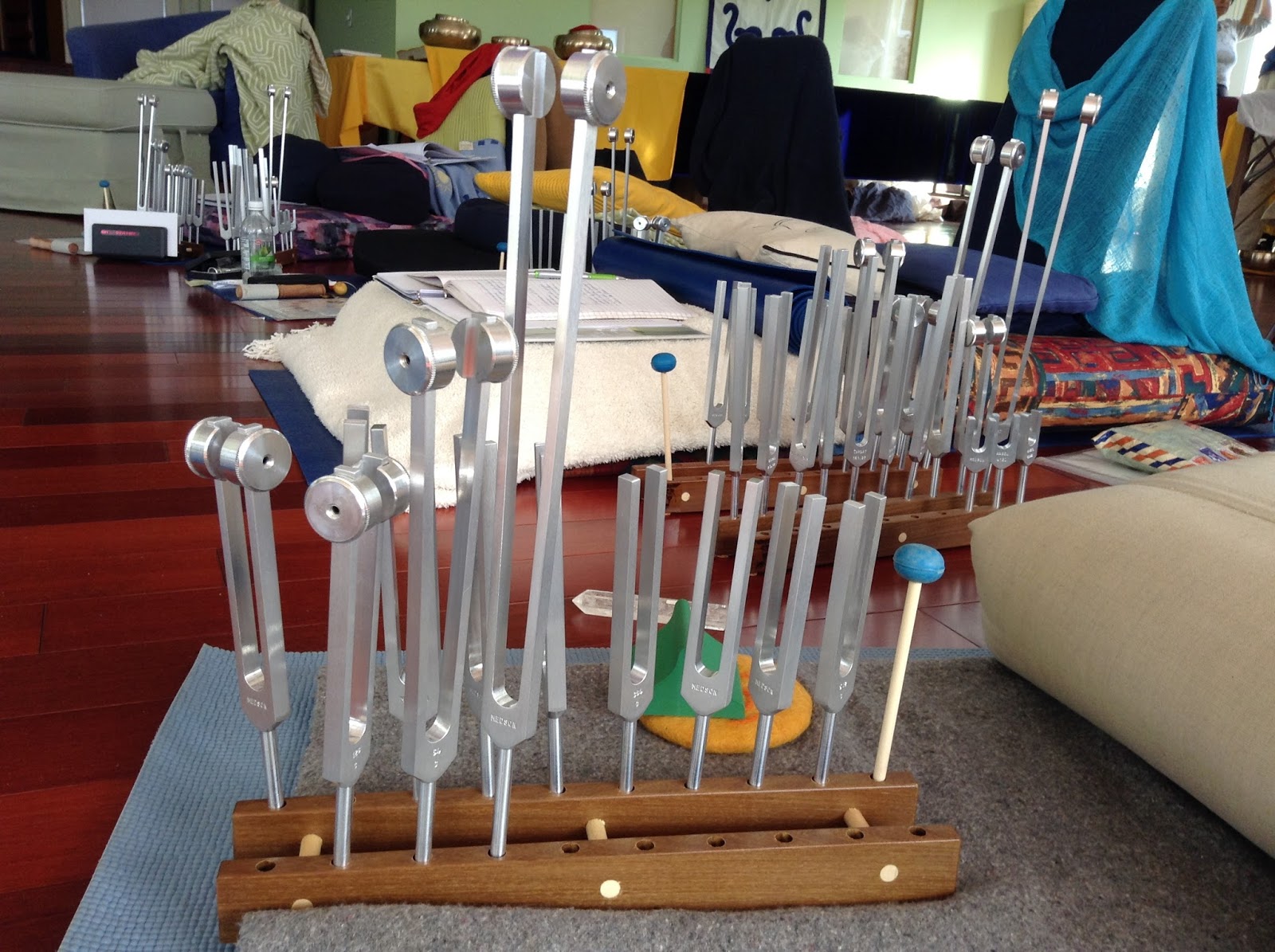 Suivant l’endroit où les bols ou les diapasons sont posés, il vont propager leurs vibrations puissantes dans tout le corps.