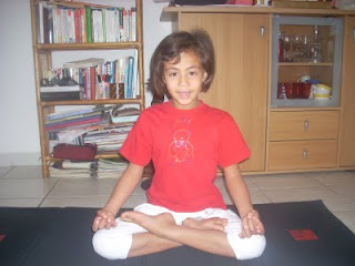 Voici la photo de ma petite fille Amélie 7 ans qui habite dans le sud de la France et que j’ai fait venir pour 3 semaines en Juillet 2009 pour les vacances. Nous avons passé des moments merveilleux, et je l’ai initié au yoga. La pauvre chérie est asthmatique avec un terrain allergique et ne savait déjà plus respirer par le ventre. Elle réclamait sans arrêt : « Mamy on fait du yoga ? » Merci à vous pour votre initiative d’aider les enfants malades ! »